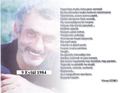 Hayat bize mutlu olma şansı vermedi Biz kendimizden başka Herkesin üzüntüsünü Üzüntümüz, Acısını acımız yaptık. Çünkü Dünya'nın öbür ucunda, Hiç tanımadığımız bir insanın Gözyaşı bile içimizi parçaladı... Kedilere ağladık Kuşların yasını tuttuk. Yüreğimizin yufkalığı Kimi zaman hayat karşısında Bizi zayıf yaptı. Aslında ne güzel şeydir İnsanın insana yanması Sevgili... Ne güzeldir bilmediğin birinin derdine üzülmek ve çare aramak. Ben bütün hayatımda hep Üzüldüm, hep yandım.. Yaşamak ne güzeldir be sevgili Sevinerek, severek, sevilerek, Düşünerek... ve o vazgeçilmez sancılarını Duyarak hayatın