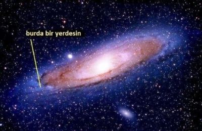 Böyle bir boşlukta, böyle bir uzayda, böyle bir muammada, devede kulak bile olmayan, kıl bile olmayan bizim galaksimiz Samanyolu ve Samanyolu galaksisinde nokta bile olmayan bizim güneşimiz var