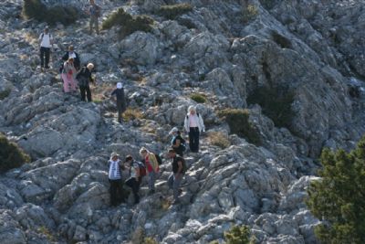 Oldukça taşlık bir alanda yürüyoruz. Ağaçların sayısı, varlıklarını hissedemiyeceğimiz kadar seyrek.. Dere yatağı olduğu anlaşılan bu yarıktan bir süre sonra çıkıyoruz. Çam ağaçlarının biraz daha yoğun olduğu tepeye doğru ilerliyoruz. Ama taşların varlığı hala egemenliğini sürdürüyor. Bu taşların arasından lila rengiyle boynunu uzatan çiğdem çiçekleri sevincimiz oluyor. Biraz sonra çiğdem çiçeklerinin varlığının sadece bizi mutlu etmediğinin ayırdına varacağız. Zira yürüyüş boyunca toprağın eşelenip küçük oyuklar açıldığına tanık olacağız. Toprağın kuruluğundan bir kaç saat önce eşelendiğini anlıyoruz. Çiğdem çiçeklerinin toprağın altında kalan soğanına bayılan domuzların hünerleri bu küçük oyuklar... Çiğdem çiçekleri, domuzların varlığı derken tepeyi aşıyoruz. Biraz önce seyrek olan çam ağaçları yoğunlaşıp ormana dönüşüyor. Ve biz kahverengi bir halıda yürüyormuşcasına huzurluyuz. Ormanın içindeki bu huzurlu yürüyüş, farkına varmadan yükseldiğimizi hissettirmiyor. Oysa irili ufaklı bir kaç tepeyi ardımızda bırakıyoruz. Ormanın bitimiyle beraber görüntü alanımıza giren dik yamaç, yorgunluğumuzu hissettiriyor. Tırmanmaya başlıyoruz. Ağaçlar sayılarını azaltırken, taşların yoğunluğu çoğalıyor. Birden önüm sıra bir hareketlenme hissediyorum. Varlığımızı hisseden çok sayıdaki kekliğin havalanması bu.. Ne zaman havalandılar, nereye gittiler derken zirveye ulaşıyoruz.